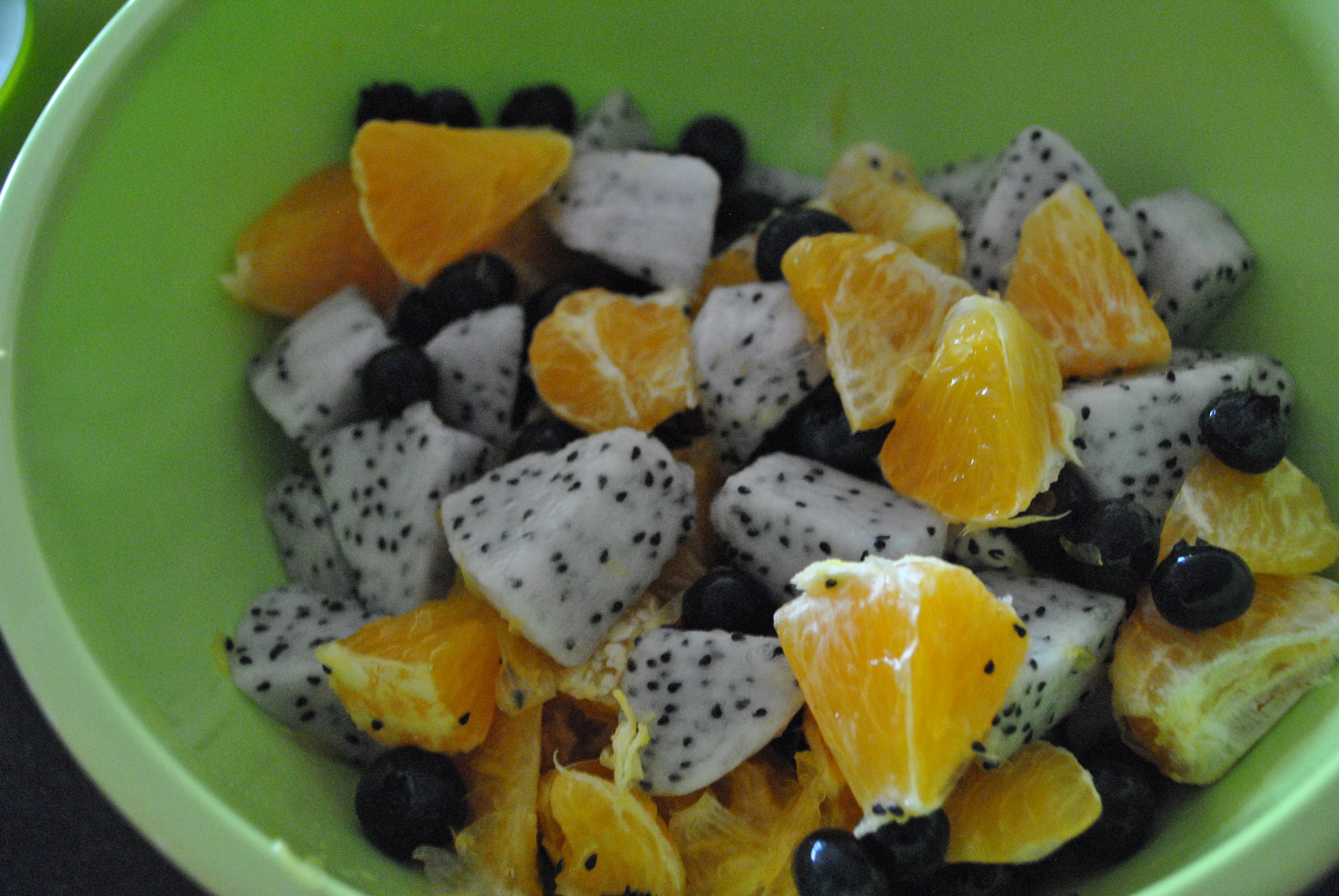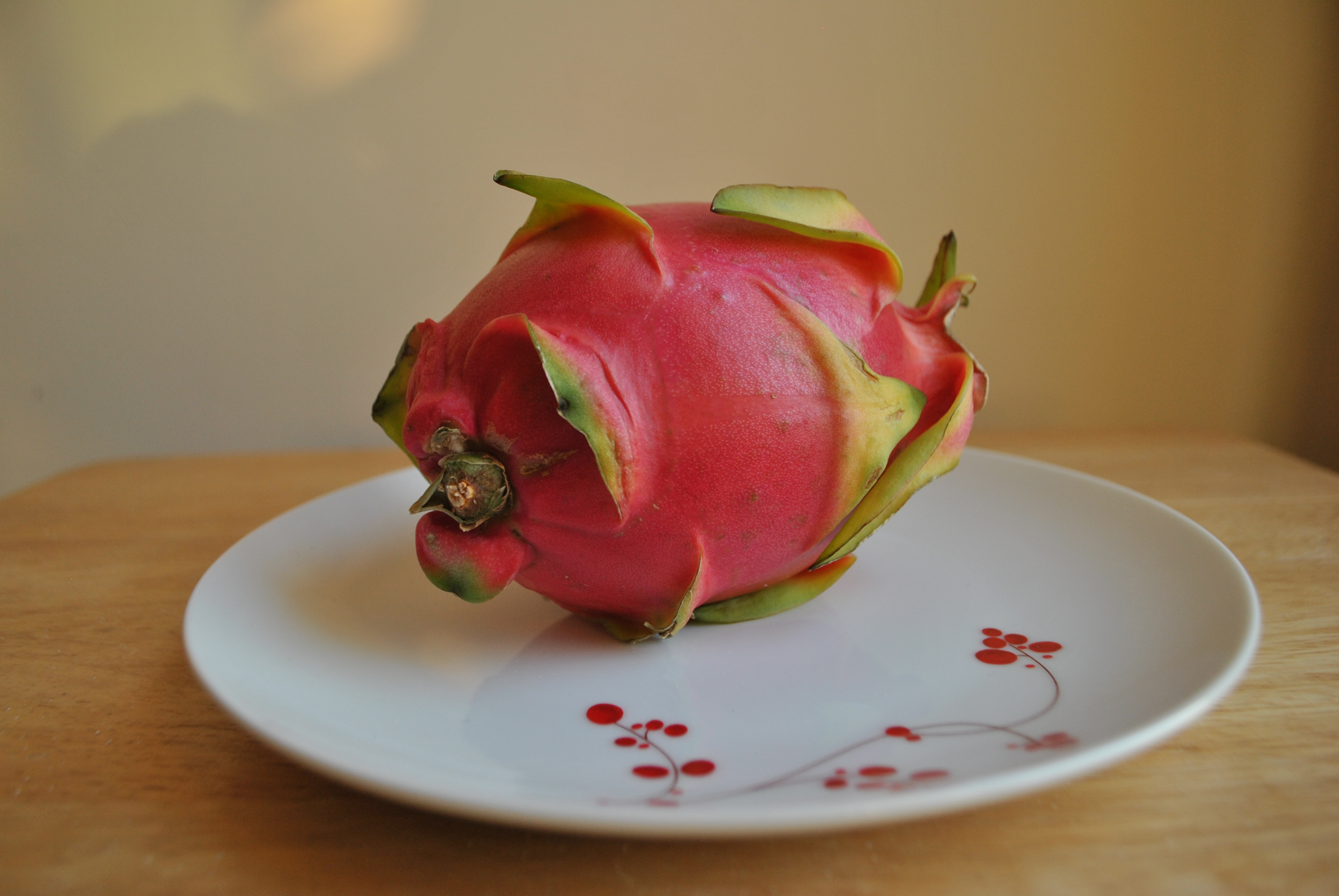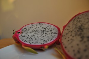 I love Dragon Fruit. I first had this cactus fruit on one of my trips to Hong Kong and China. By itself, it’s so pretty. This wonderful shade of a magenta like pink with green leaves. The insides are white speckled with little black seeds. The taste itself is very very subtle. The texture is refreshing and the seeds give it a nice crunch. It can be eaten alone, but is really best when paired with something else more flavorful.