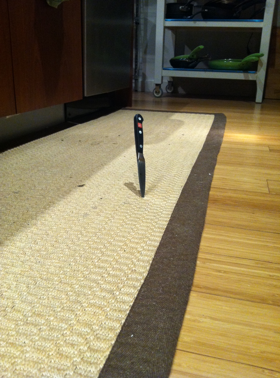 Yup. That is a knife, that flew out of my distracted hand, spun about a few times, and stabbed my floor. It went all the way through that runner and into my bamboo flooring. In fact, it took a pretty good tug to remove it from the floor!